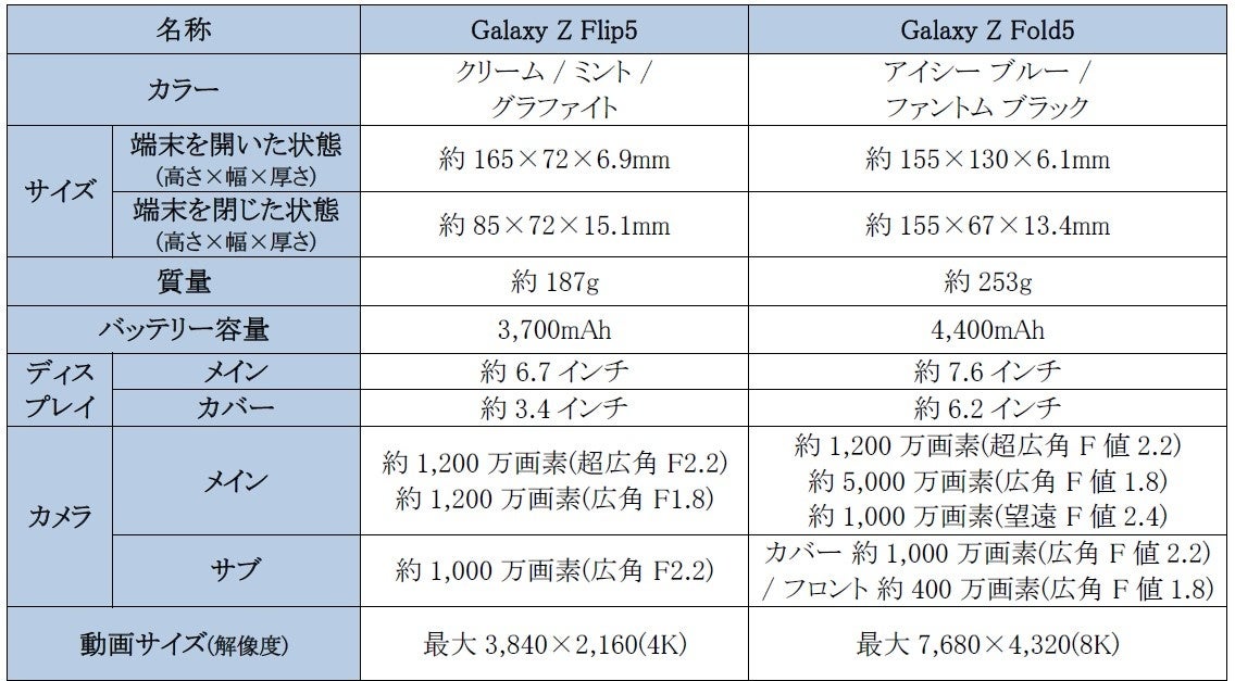 <主な仕様 : 「Galaxy Z Flip5」および「Galaxy Z Fold5」>