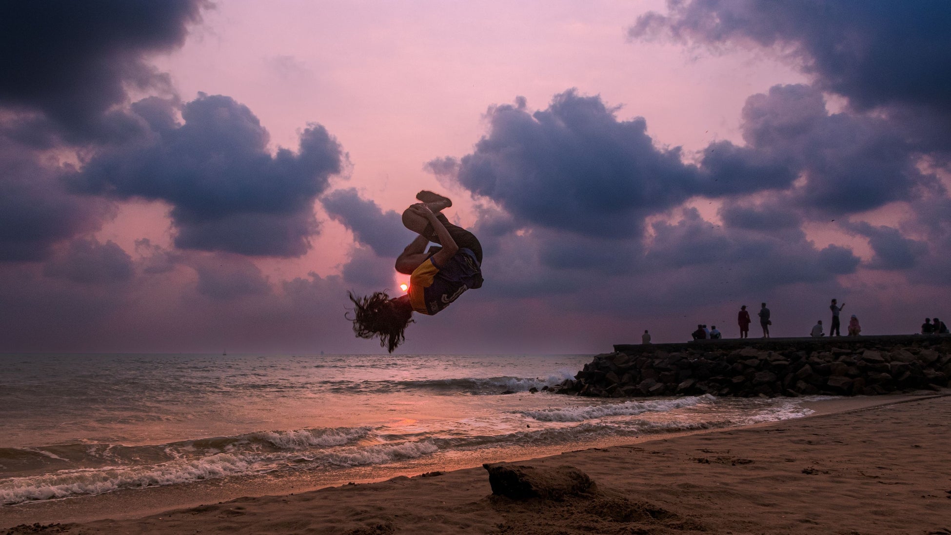 柔らかさと強さを併せ持つ光の表現が印象的で、構図の完成度も非常に高い作品です。空中に捉えられた被写体がフレーム全体にダイナミズムをもたらし、人物の近くに配置された太陽が、決定的瞬間を的確に捉えた優れたタイミングを際立たせています。
