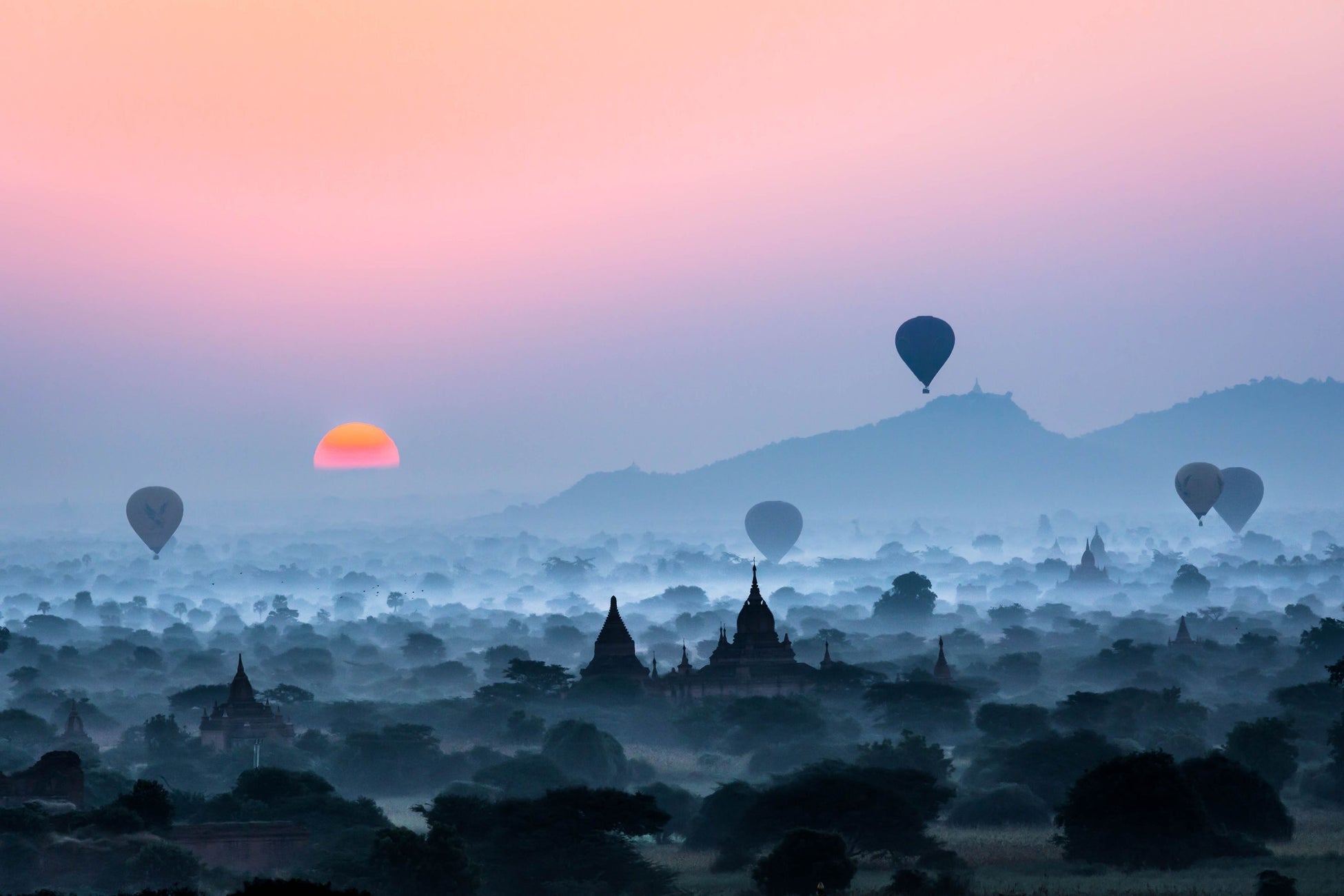 低く差し込む太陽光と霞んだ空気感が、奥行きのある情景を的確に描き出しています。シルエットで捉えられた遠景の建築物が画面に緊張感を与え、そこに配置された熱気球が物語性と視覚的なアクセントを加えています。左から右へと自然に視線を導く構図も完成度が高く、全体として非常にバランスの取れた一枚です。