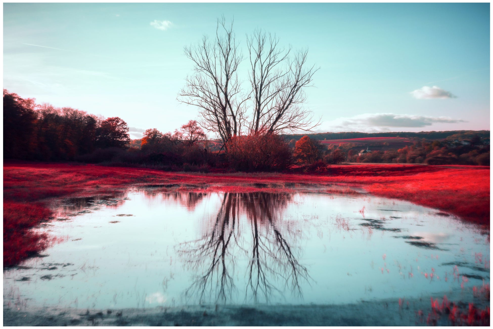 赤外線撮影ならではの表現が際立ち、現実を超えたような独自の世界観を生み出しています。視点や撮影手法の選択が、写真の印象を大きく変えることを示す好例であり、作者の明確な意図が感じられます。中央に配置された木の反射が画面全体の構成を引き締め、静けさの中に確かな安定感をもたらしています。