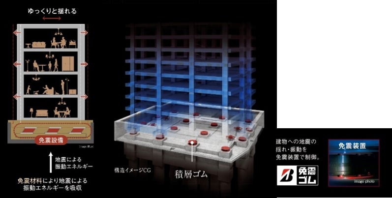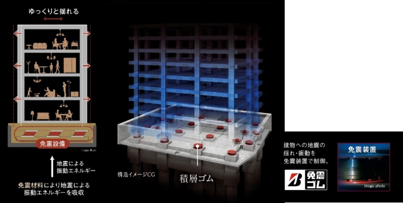 地震のエネルギーを分散し、大きく長い揺れを低減する免震装置を基礎部分に設置しています。建物と地盤の間に緩衝材を設置することで、地震の揺れを建物に直接伝えずに吸収し、建物全体がゆっくり揺れる仕組みを作っています。建物の揺れが静かなことが特徴です。