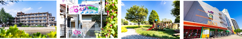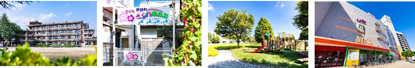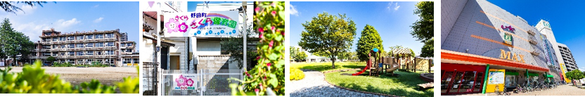 ※左から、市立 三河台小学校(徒歩8分)、私立 野田町さくら保育園(徒歩5分)、新浜公園(徒歩22分)、イオンシネマ福島(徒歩13分)