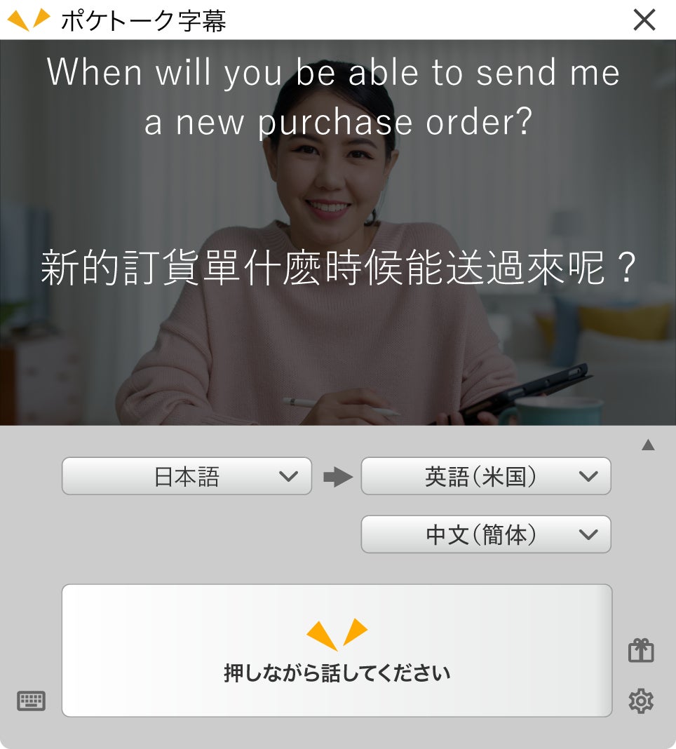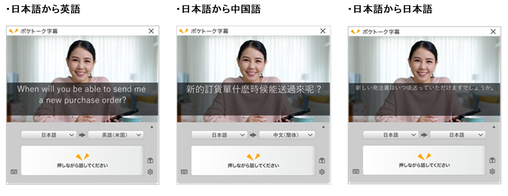 本製品は、ZoomやTeamsなどのリモート会議システム上で、自分が話した言葉を指定した最大2言語に瞬時に翻訳し、画面に字幕として出せるソフトです。AI通訳機「ポケトーク」端末がなくても、リモート会議に使用しているパソコンさえあれば使えます。82言語に対応し、世界中で、通訳を必要としないスムーズなリモート会議を実現します。