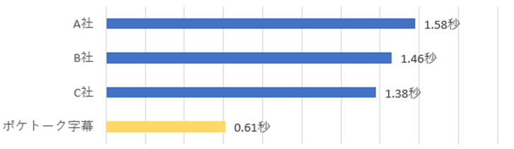 「ポケトーク字幕」の、発話が終了から翻訳結果が字幕表示されるまでの速度は、他社ビデオ会議システムに搭載された翻訳機能より3.2倍以上速い結果が得られています(音声の長さが0.90秒の場合)。