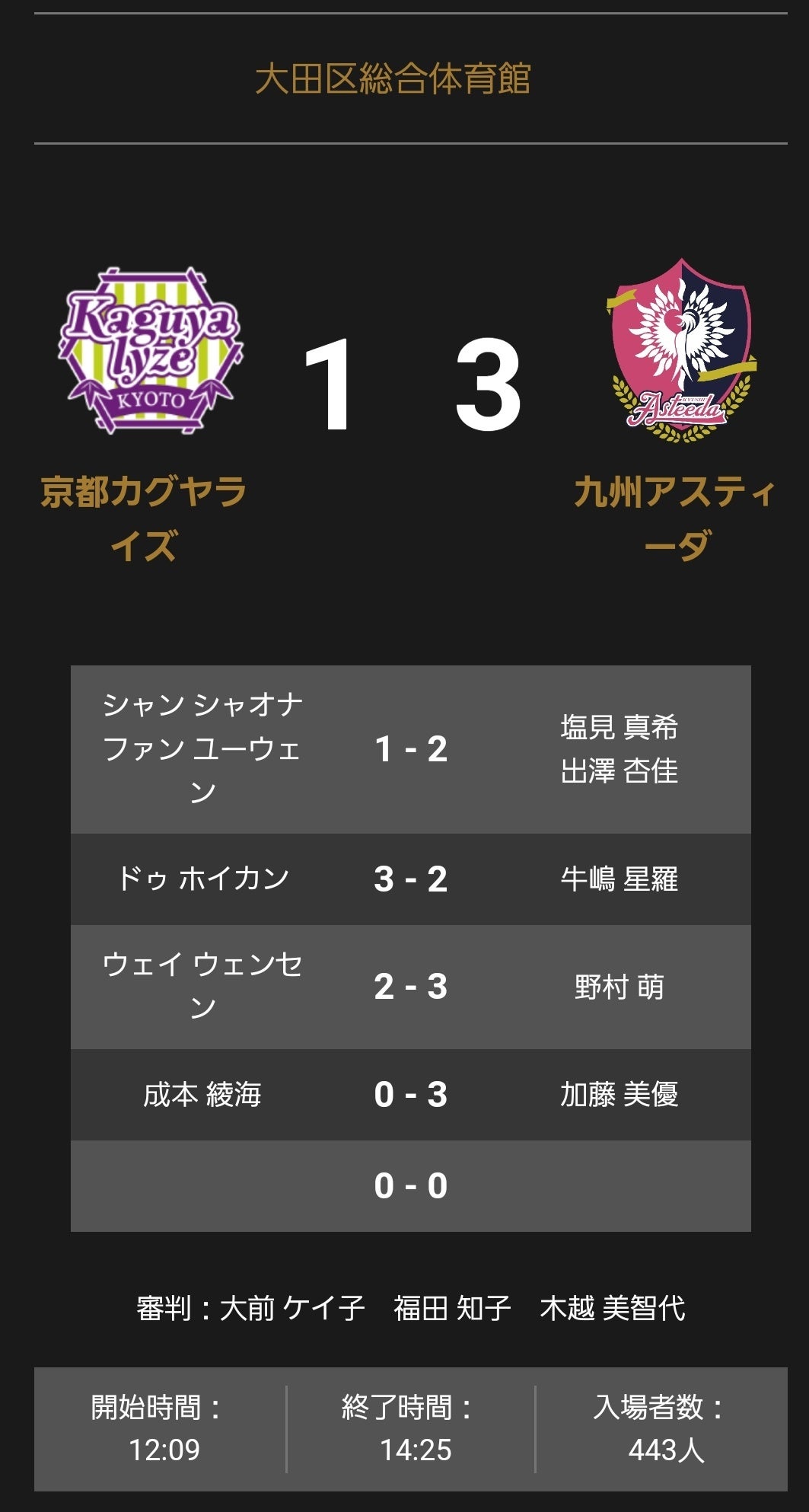 京都カグヤライズと九州アスティーダの試合は、3-1で九州アスティーダが勝利しました。