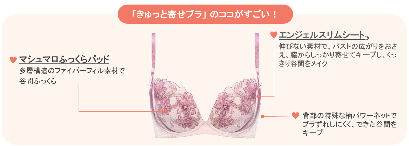 カップ脇の伸びないエンジェルスリムシートⓇで、脇からバストをしっかり引き寄せてキープし、取り外し可能なマシュマロふっくらパッドでボリュームアップ!くっきり美しい谷間をメイクする、その名の通りの“きゅっと寄せ”が特長。背部には特殊なパワーネットを使用したズレにくい仕様です。すっきりとした脇と、作った谷間とのメリハリ感でスリムに魅せます。