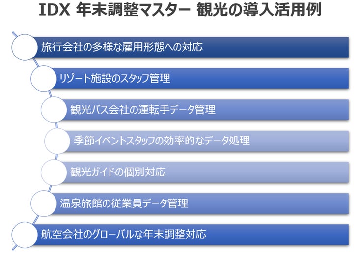 「IDX 年末調整マスター 観光」は、観光業界の特性に合わせた効率的なソリューションを提供し、企業運営をより円滑に進める支援を行います。