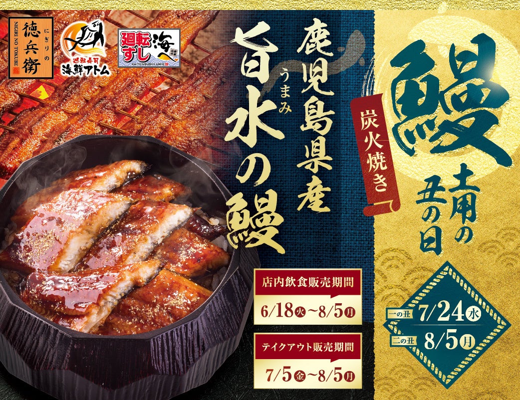 今年の土用丑の日は鹿児島県産「旨水の鰻(うまみのうなぎ)」!グルメ廻転寿司 にぎりの徳兵衛、海鮮アトムなど46店舗でこだわりの「すし屋のうな重」6月18日(火)より販売開始!