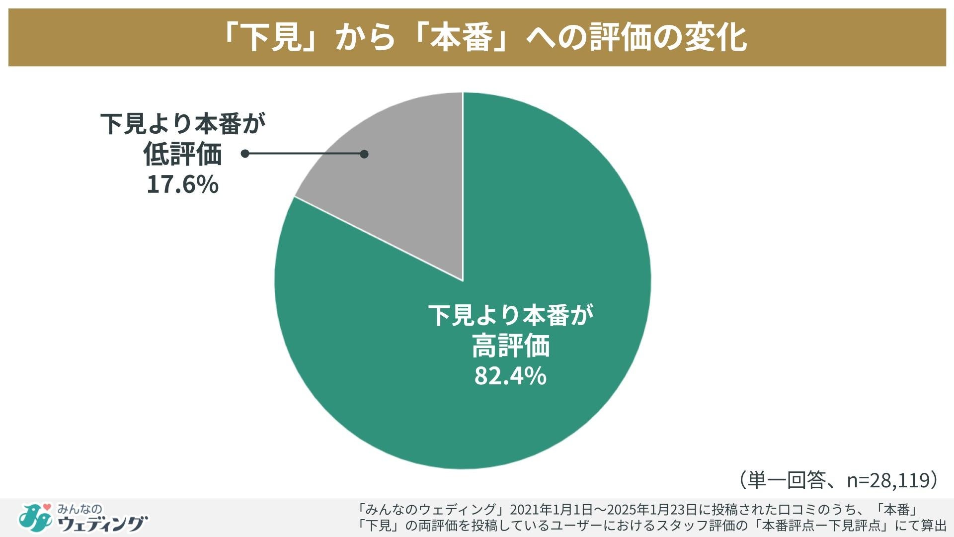 また、「本番」と「下見」(式場見学時)両方の口コミ評価を投稿したユーザーを対象に、本番と下見のスタッフに対する評価の差分を調査しました。スタッフとは結婚式の準備期間を経てコミュニケーションが進むため、一般的には本番にかけて評価が上がっていくべきところ、約2割が評価を下げていることがわかりました。5人に1人が下見から本番までに何らかの理由でスタッフに不満を感じたことがわかります。