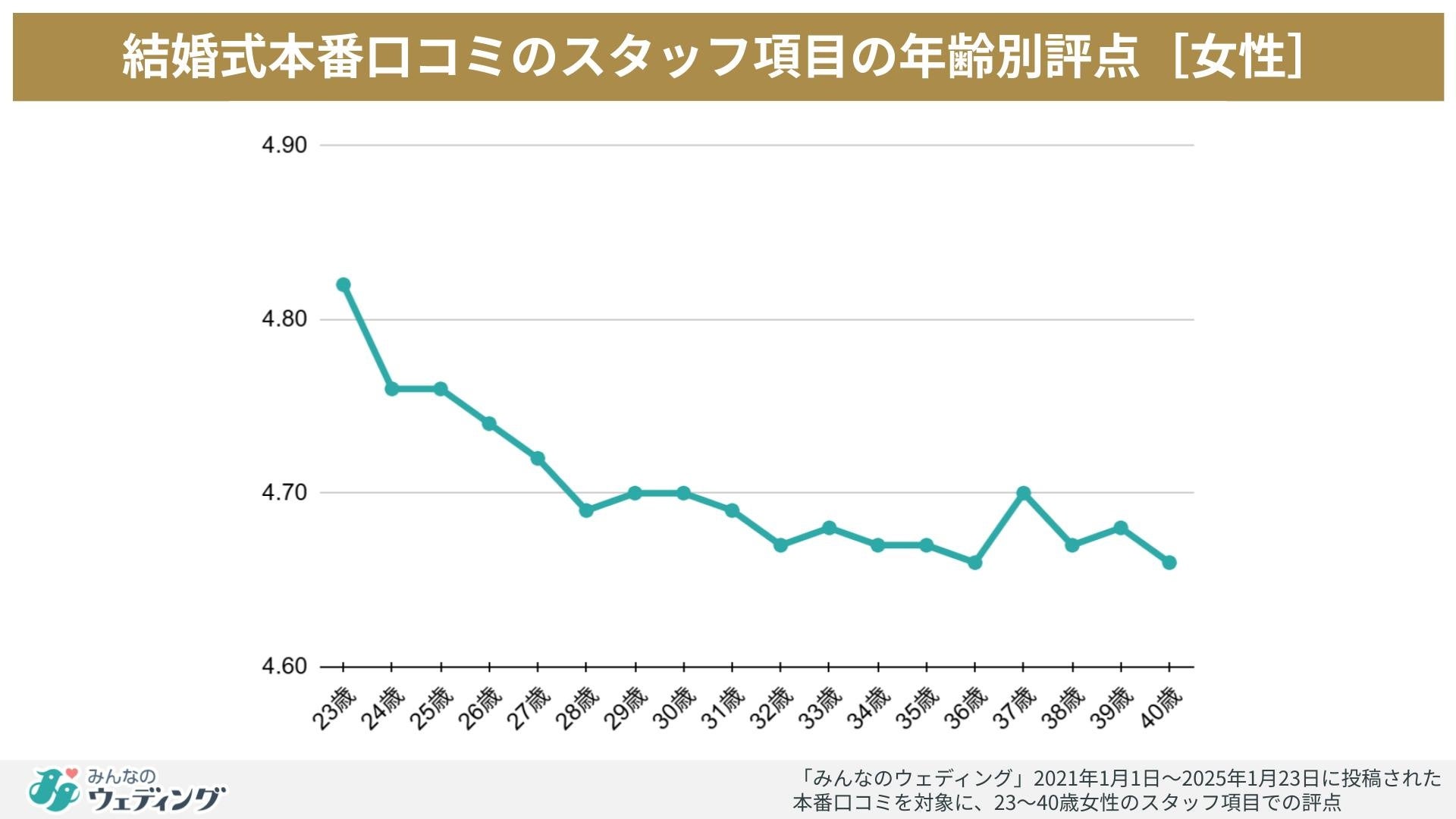 さらにスタッフに対する評価を投稿者の年齢別に見ると、20代前半から下がり続け、30代になると4.7を切る水準まで下がります。社会人経験を重ねることでより厳しく評価するようになる可能性が考えられます。多くの人にとって結婚式は数百万円の大きな買い物であり、スタッフにそれ相応の対応を求めるのは当然のこと。より厳しい目が向けられ、評価に大きな影響を与えます。