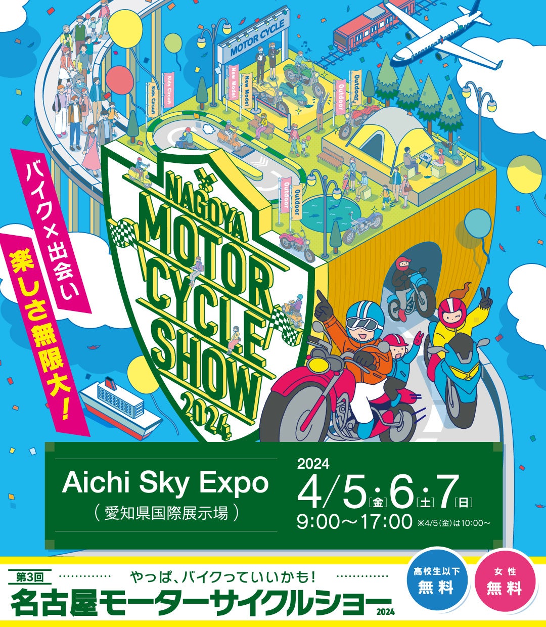 「第3回名古屋モーターサイクルショー」は、最新バイクの展示や試乗体験、トークショーに、グルメも充実!さらに、高校生までの学生さんや女性は事前登録で入場無料。