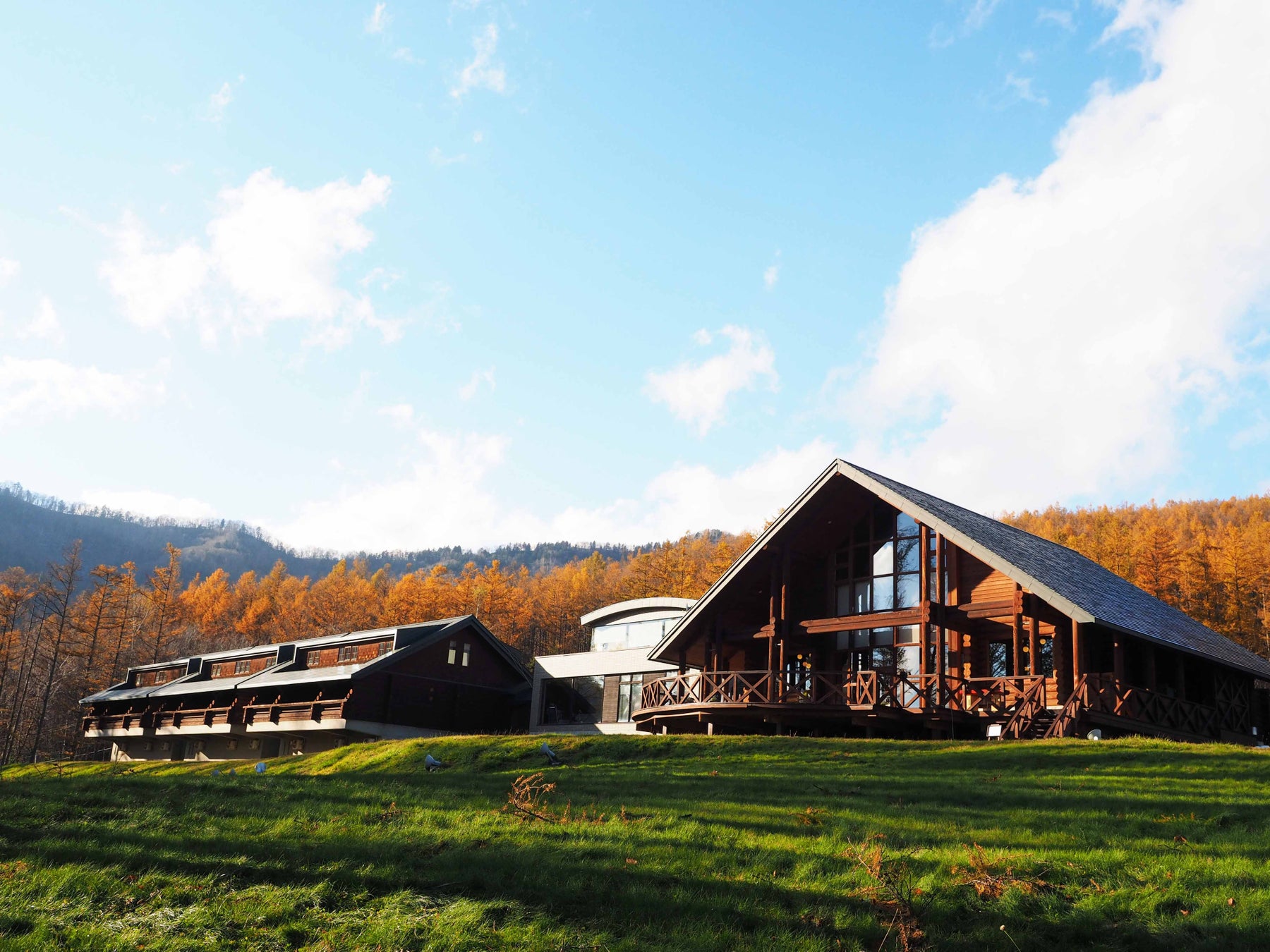 かなやま湖を見下ろすカラマツ林に囲まれた閑静な佇まいで、北海道産カラマツ材を使用した本格的ログホテル&コテージ。豊かな森に囲まれた自然あふれるログホテル。
