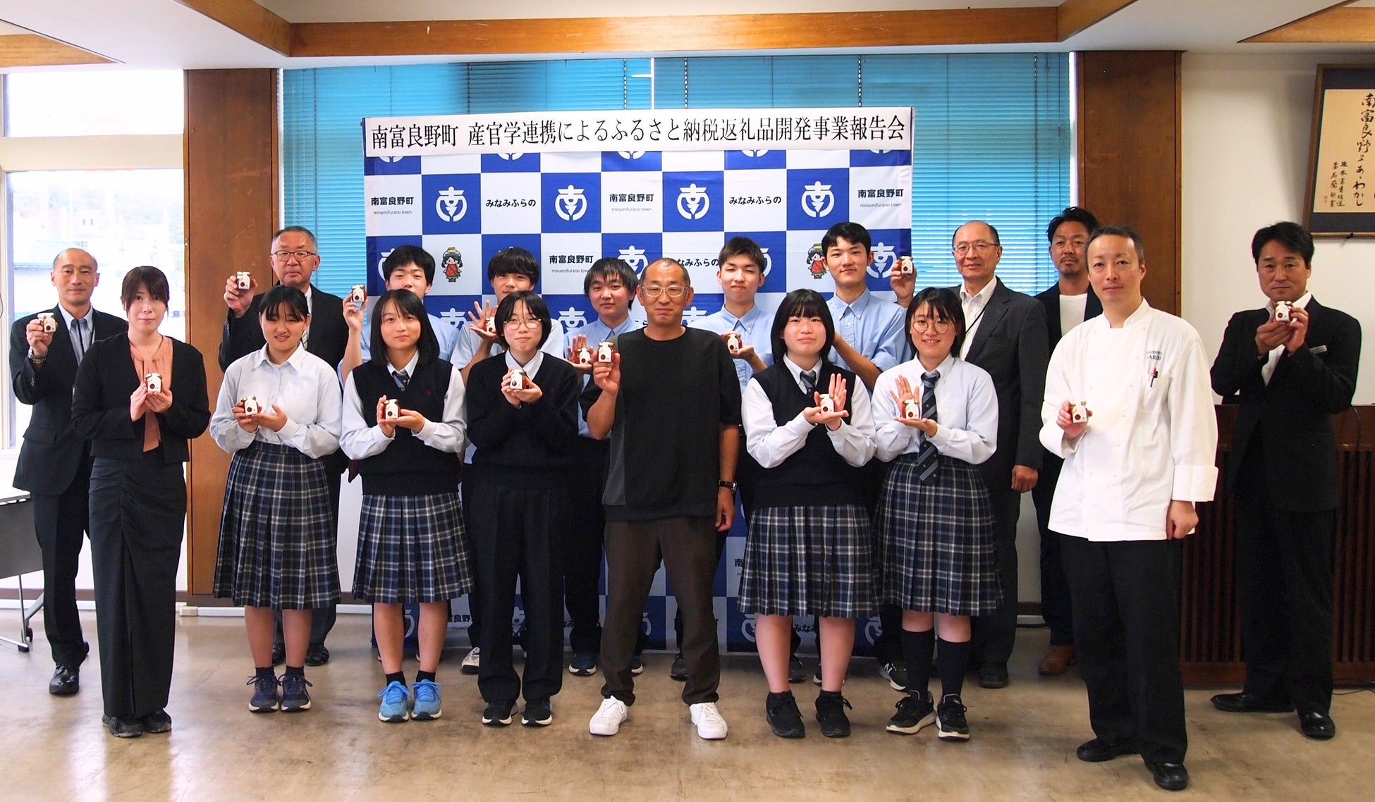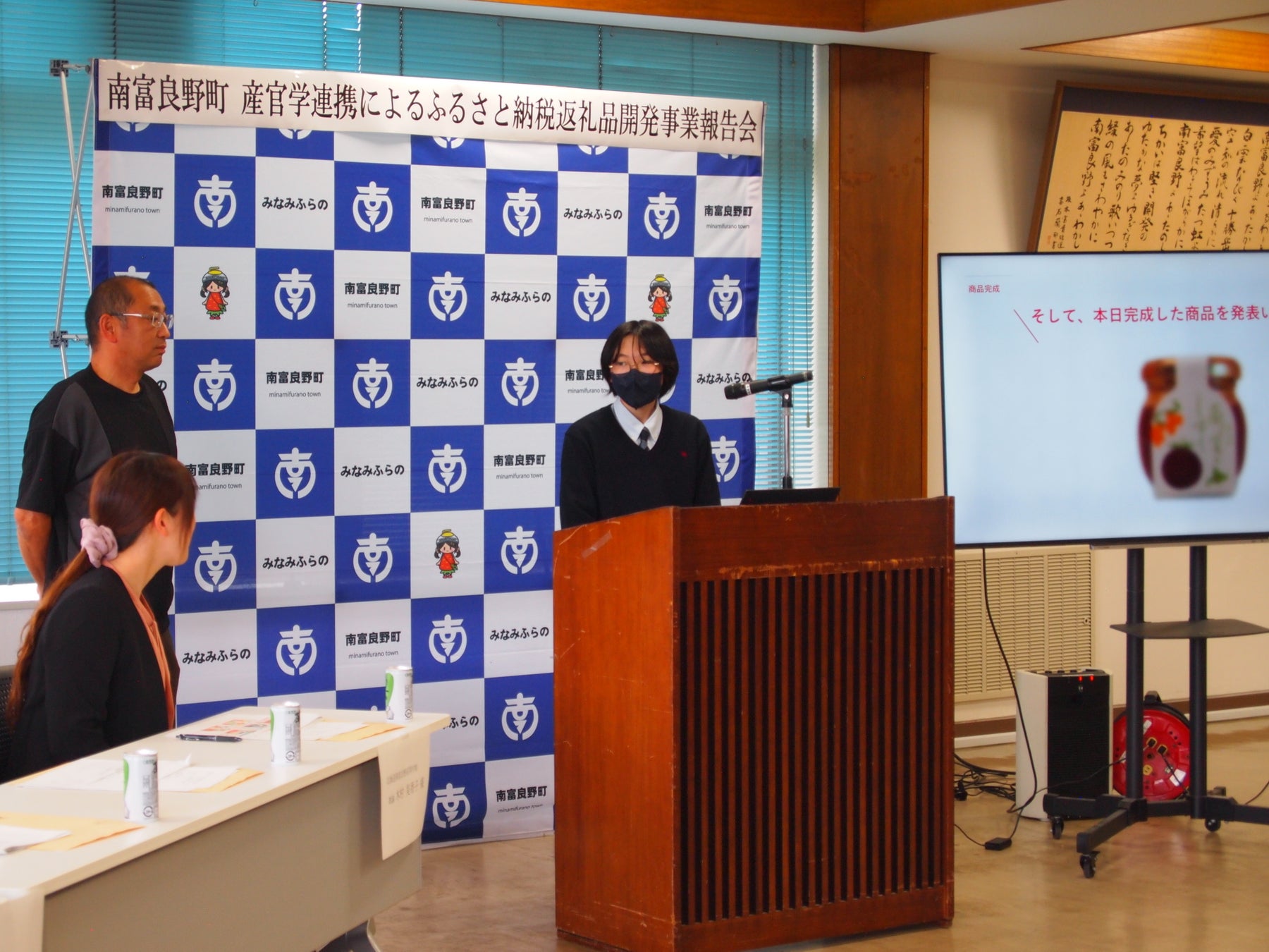 地元の高校生が町の新しい地場産品を開発し、町内事業者が商品化。産官学連携によるふるさと納税返礼品開発事業を町長に報告。