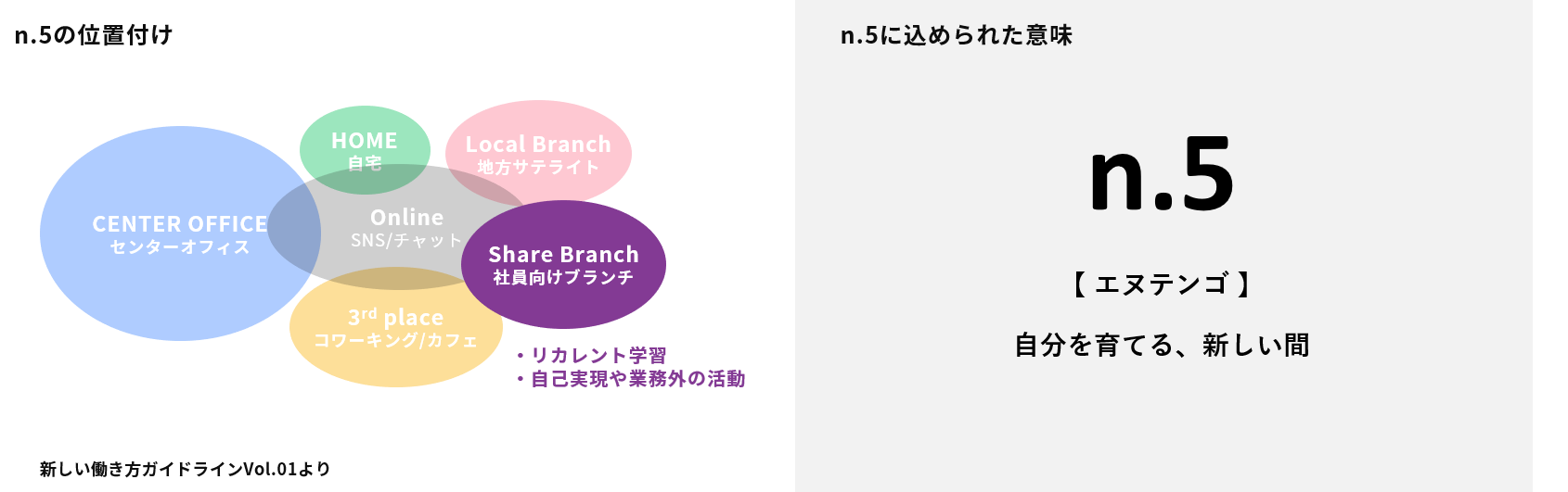 Life Based WorkingⓇという新しい働き方について、2000名弱の全社員向けにアンケート調査を定期的に実施しております。最新の調査結果では、働くことに対してのポジティブさを確証したと同時に、テレワークによって増えた可処分時間を活用するための「個人として新しくチャレンジしたい事がある」という声もたくさん集まりました。そこで、今回、社員たちを応援するために、「n.5(エヌテンゴ)」を開設。「自分を育てる、新しい間(ま)」をコンセプトに、1stプレイス(自宅)、2ndプレイス(オフィス)、3rdプレイス(カフェ、コワーキング)といった区分に縛られず、目的に応じて自在に使いこなせる場所にしたいという想いを込めて、1.5や2.5など、物ごとの「あいだ」を思い起こさせるネーミングとしました。