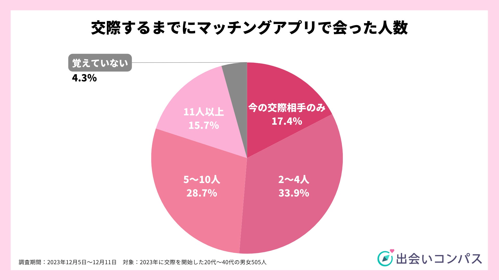 続いて、マッチングアプリで現在の恋人と交際する前に、アプリを通じて対面した人数を調査した結果、最も多いのは「2人~4人(33.9%)」、次いで「5人~10人(28.7%)」、「現在の交際相手のみ(17.4%)」という結果でした。