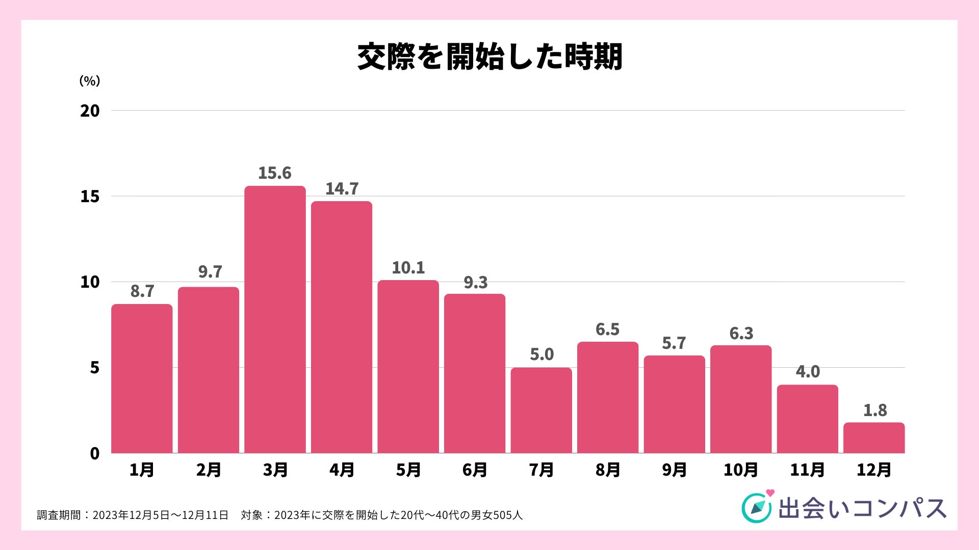 今年交際を開始した505人に、交際開始時期を聞いてみると、「3月(15.6%)」が最も多く、次いで「4月(14.7%)」、「5月(10.1%)」でした。
