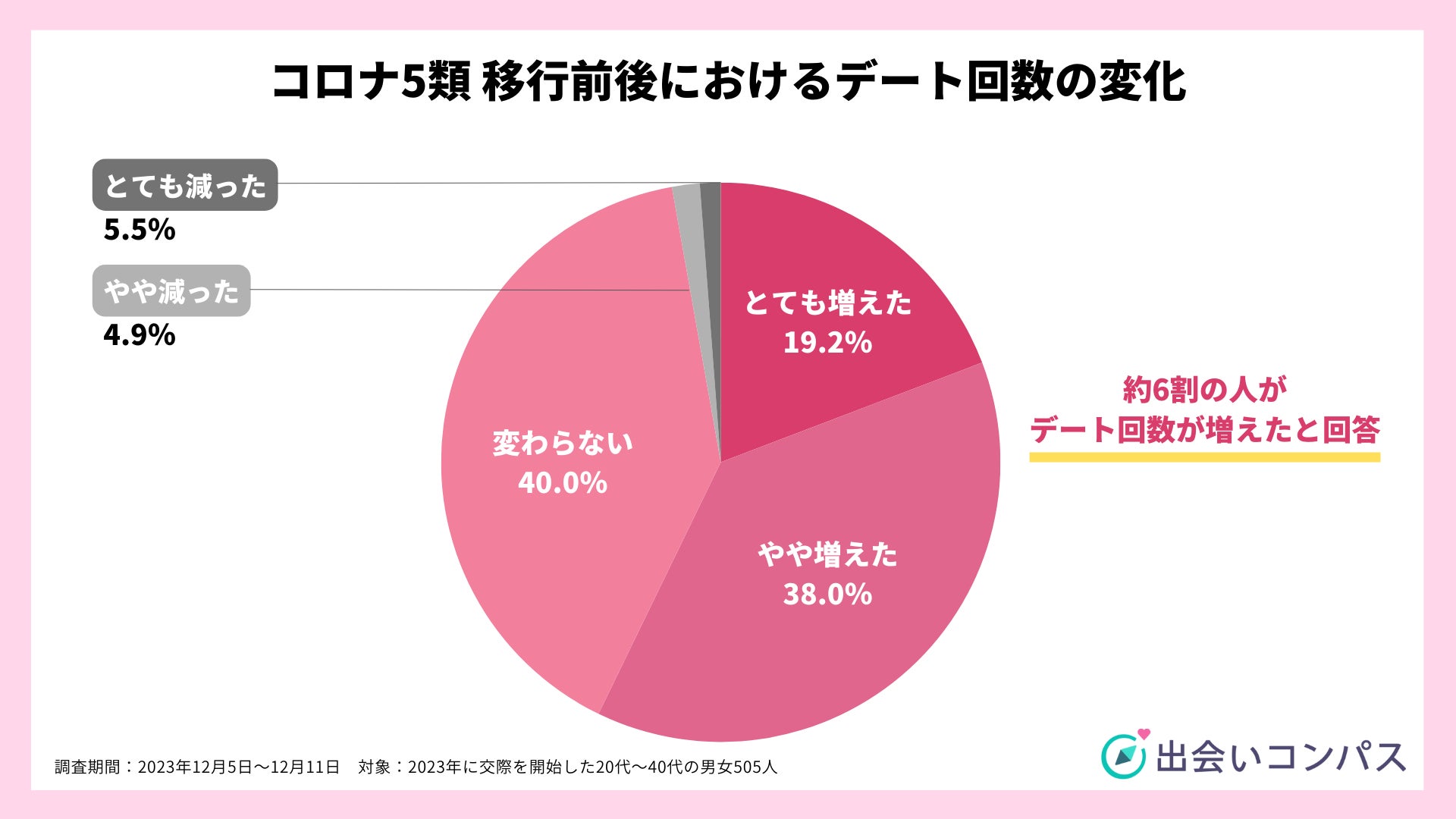 新型コロナウイルス感染症が5類に引き下げられる前後の、デート回数の変化を調査したところ、「とても増えた(19.2%)」、「やや増えた(38.0%)」、「変わらない(40.0%)」、「やや減った(1.6%)」、「とても減った(1.2%)」という結果でした。