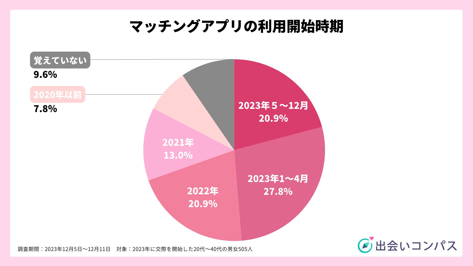 マッチングアプリがきっかけで交際している人に、いつからアプリを利用し始めたか聞いてみると、「2023年1月~4月(27.8%)」が最も多く、次いで「2023年5月~12月(20.9%)」、「2022年(20.9%)」、「2021年(13.0%)」でした。