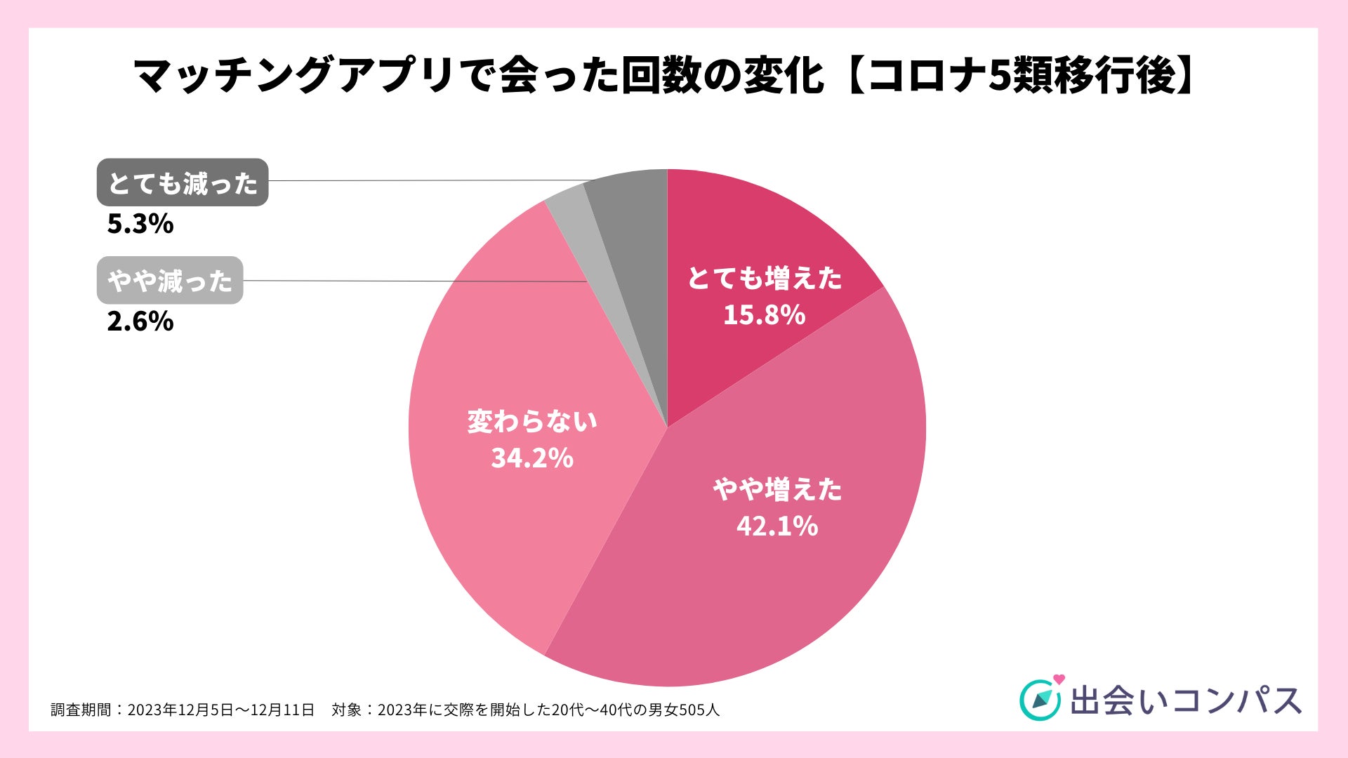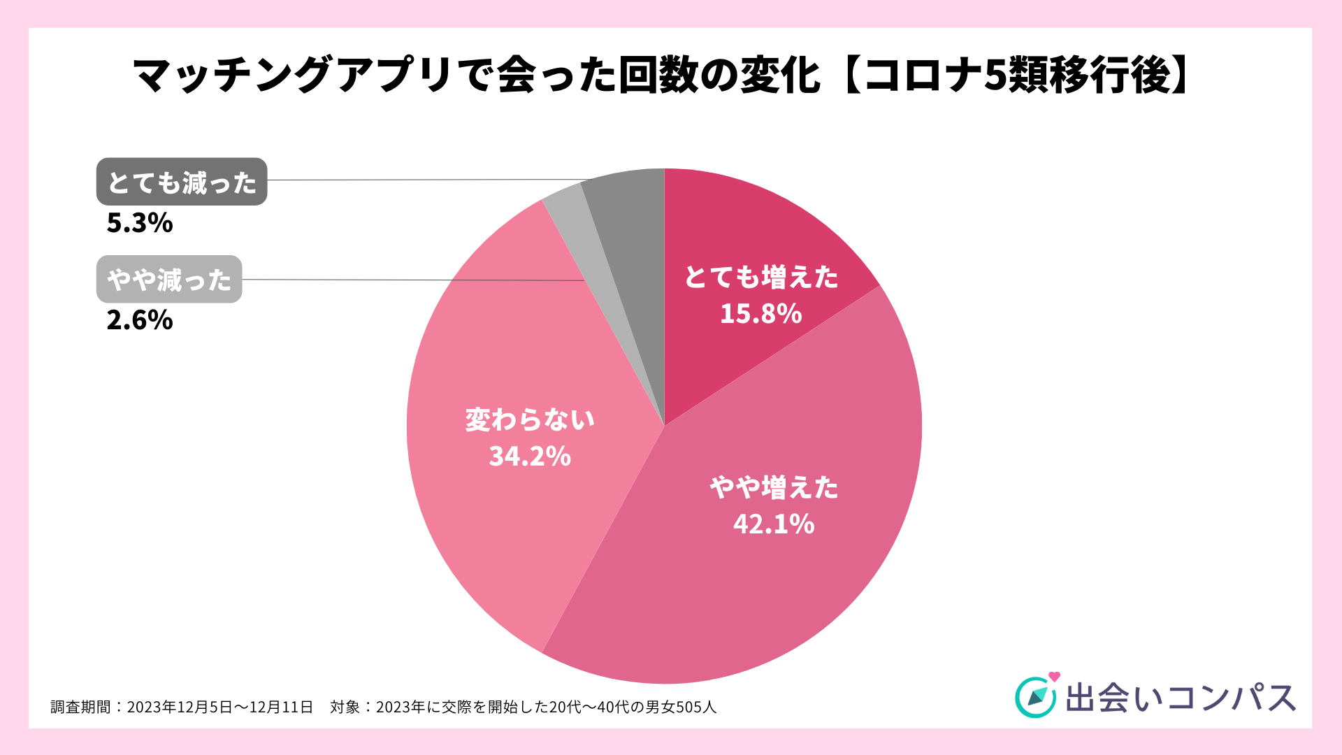 5類移行前後で、アプリを通じた相手と会う回数の変化について尋ねてみると、「とても増えた(15.8%)」、「やや増えた(42.1%)」、「変わらない(34.2%)」、「やや減った(2.6%)」、「とても減った(5.3%)」でした。