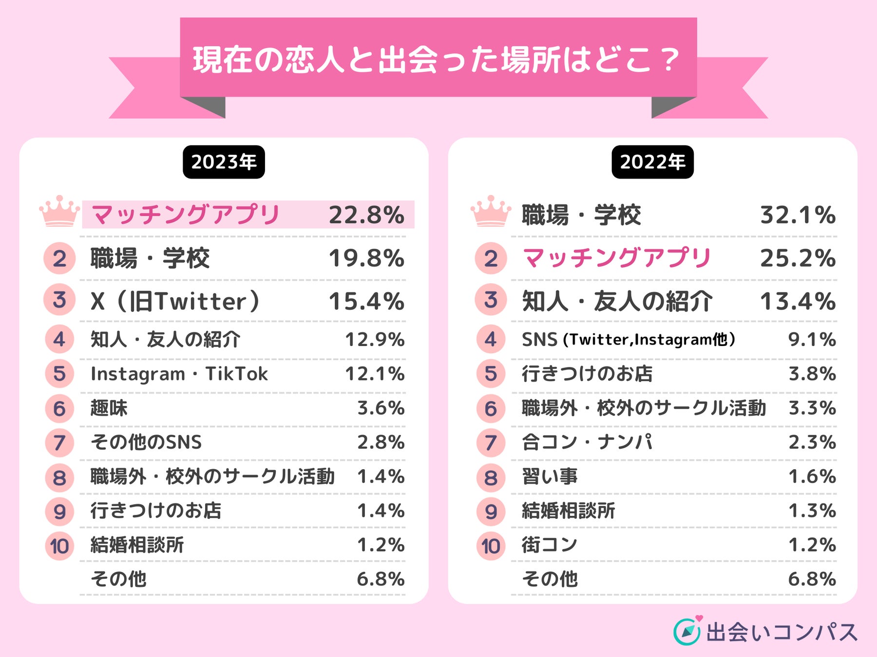 2022年の調査結果と比較すると、「マッチングアプリ」が「職場・学校」を上回り、恋人と出会ったきっかけ1位に選ばれています。
