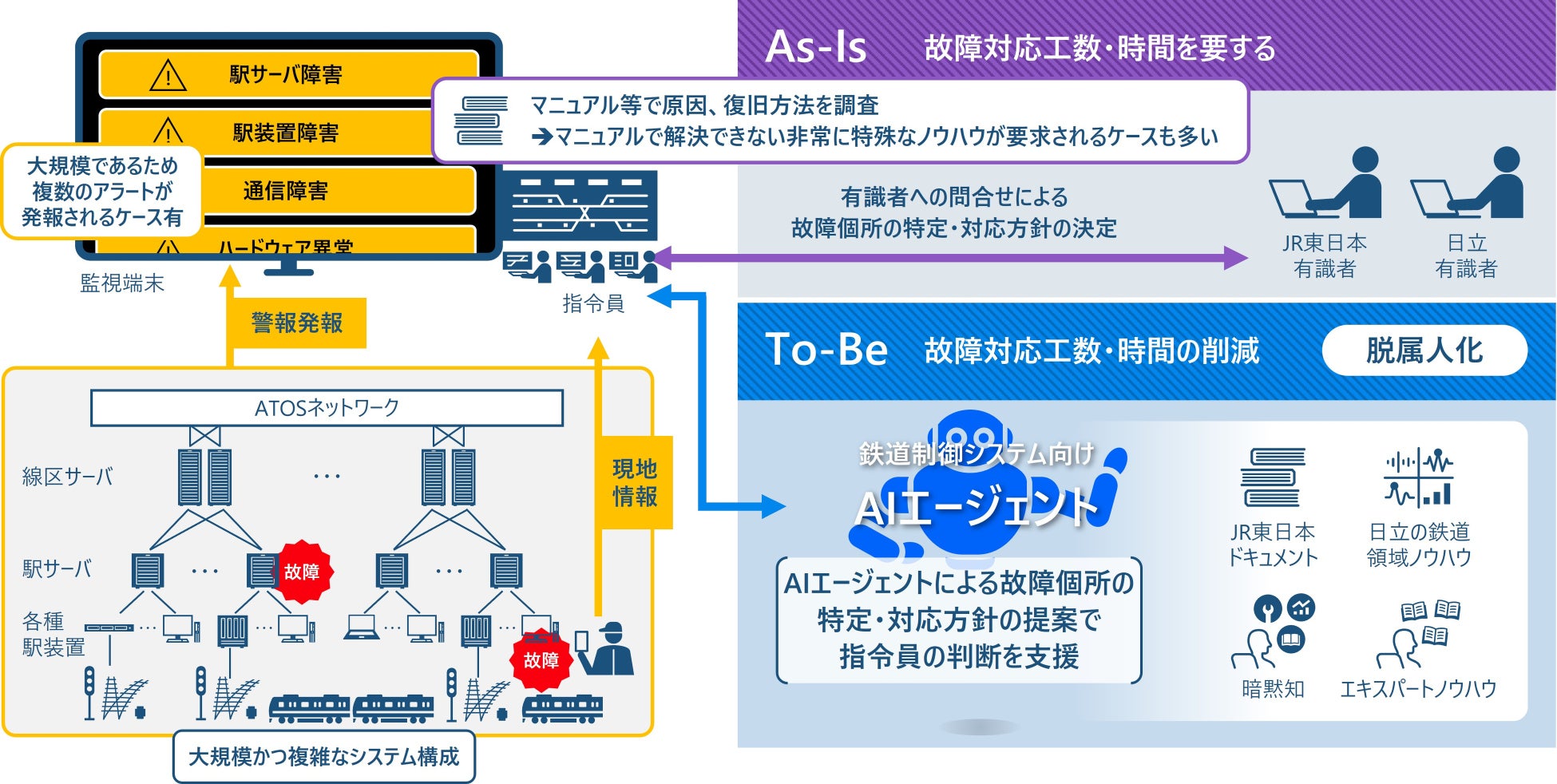 首都圏の在来線の運行を管理する東京圏輸送管理システム(ATOS)は、多くの機器が複雑に組み合わさった大規模なシステムで構築されています。そのため、トラブルや機能に関する問い合わせ等が発生した時、それらの解析や原因の特定を行う指令員には、非常に高度な専門知識やノウハウが求められます。マニュアル等での解決が難しい場合は、熟練者への問い合わせが必要となり、故障原因の特定から復旧までに時間を要することもあります。
