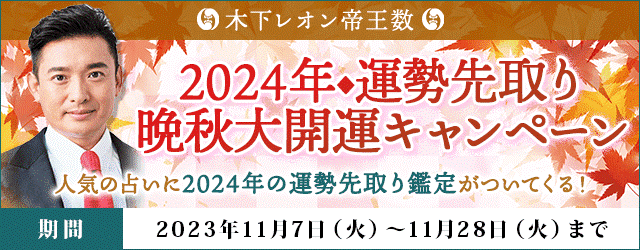 毎週火曜日夜8時より絶賛放送中の占い番組『突然ですが占ってもいいですか?』(フジテレビ系列)で、よく当たると人気の木下レオン。ただいま、月額公式サイト『木下レオン◆帝王数』にて、2024年のあなたの運勢を先取りして鑑定することができる『2024年◆運勢先取り 晩秋大開運キャンペーン』を開催中です。キャンペーン期間中、対象の占いを購入すると、2024年の運勢や重要な転機、運命の出会いや恋のチャンスを先取りして知ることができるおまけ鑑定をプレゼント!ぜひこの機会にお試しください。