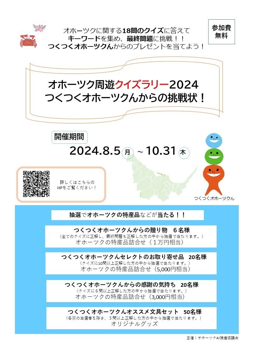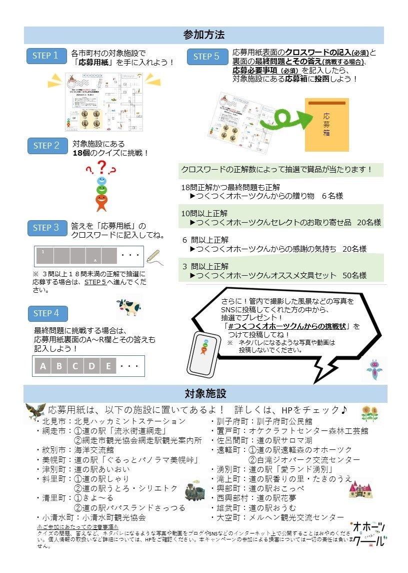 オホーツク管内18市町村の魅力を知ってもらうため、地元住民や観光客に向けて、管内の周遊及び消費喚起を行い、地域経済の活性化を促進するとともに、SNSへの写真投稿を呼びかけ、オホーツク地域の認知度向上を図ることを目的として、次のとおり「オホーツク周遊クイズラリー2024~つくつくオホーツクんからの挑戦状!」を実施しますので、お知らせします。