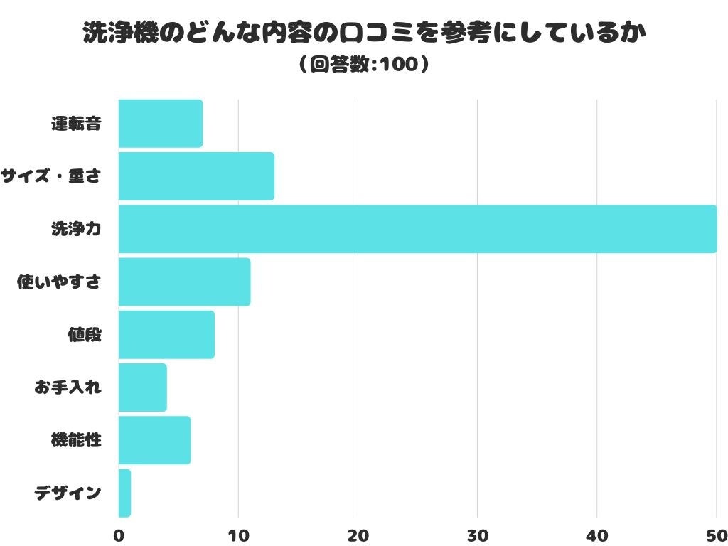 洗浄機のどんな内容の口コミを参考にするかをアンケートにて調査したところ、1位は「洗浄力」でした。