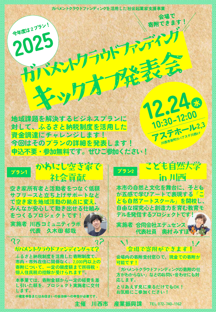 兵庫県川西市では、「みんなが交流し、賑わいが生まれる川西をつくる」ために、地域課題の解決に向けた2つのビジネスプランの発表会を開催します。さらに、プランを実行するための資金調達に向けてガバメントクラウドファンディングを実施します。