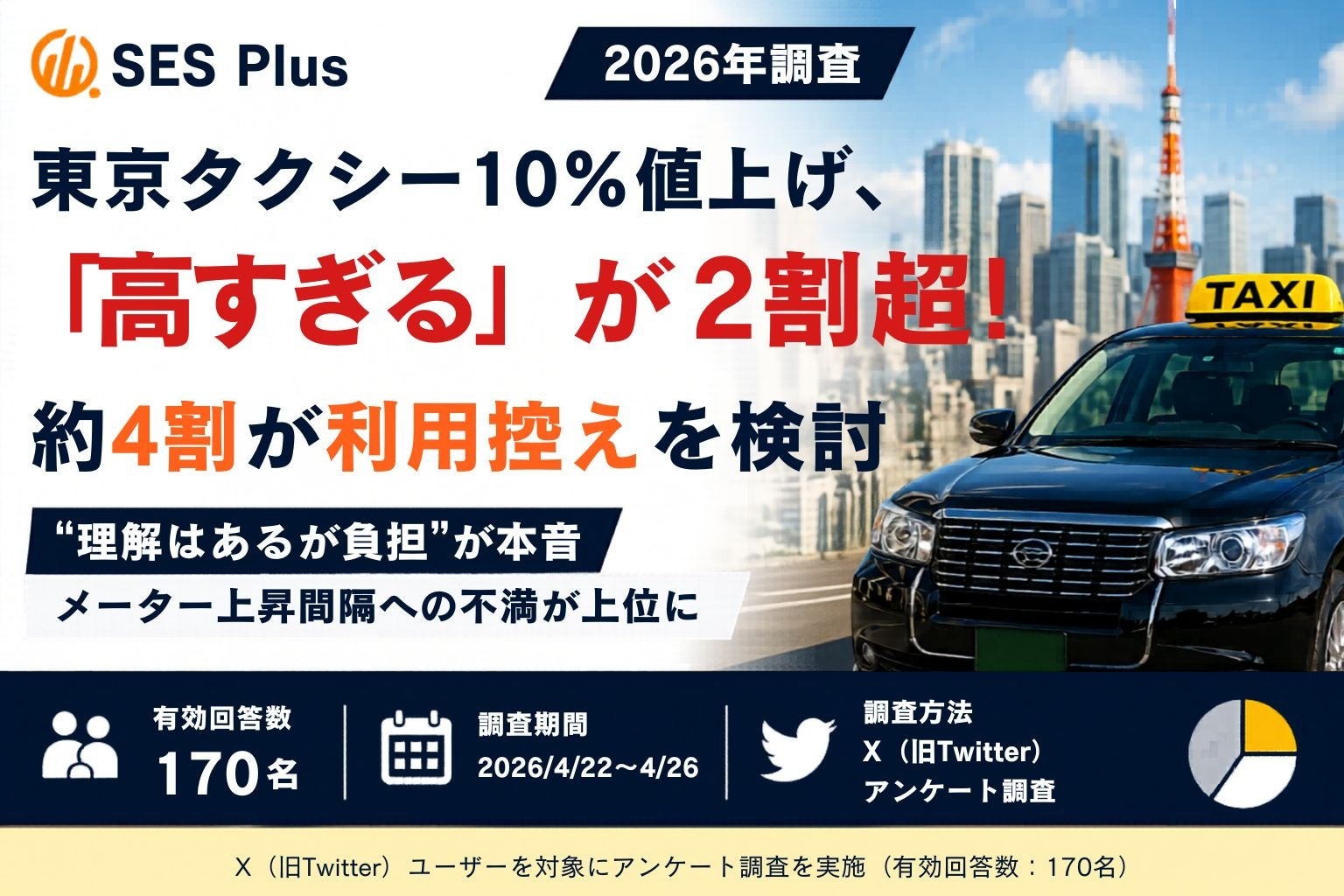 株式会社ファーストイノベーション(本社:東京都中央区、代表取締役社長:木ノ根雄志、以下ファーストイノベーション)は、運営メディア「SES Plus」にてX(旧Twitter)ユーザー170名を対象に「東京のタクシー代値上げどう?」の結果をもとに、「タクシー値上げに関する意識調査ランキング2026」を発表しました。