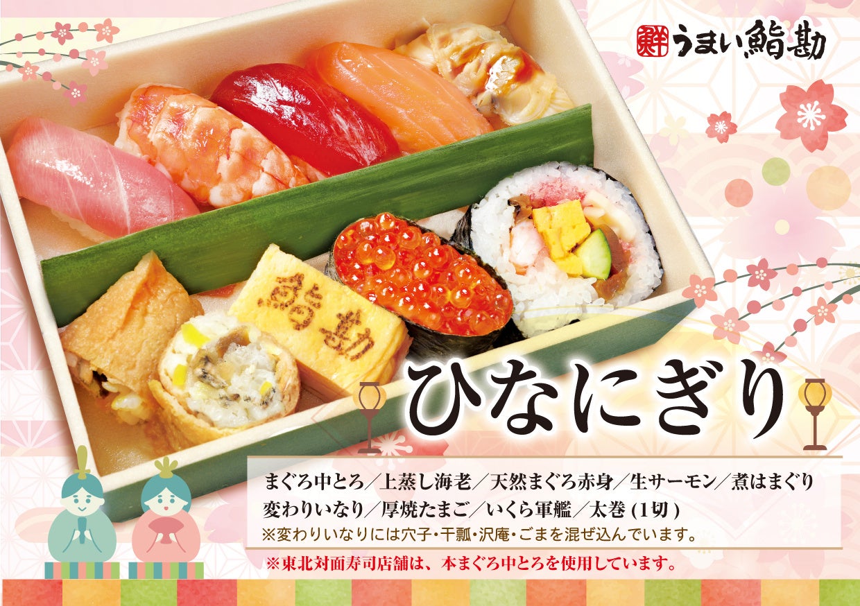 株式会社アミノ(本社:宮城県仙台市、代表取締役社長:上野 敏史)が運営する寿司業態 「うまい鮨勘」では、2025年2月3日(月)から「ひなまつり」の特別お持ち帰り寿司のご予約を開始します。