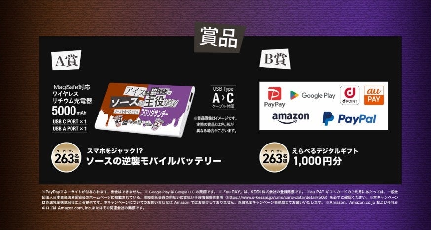 フロリダサンデー(全品)購入したレシートで応募すると、まるでソースが侵食したようなデザインの「ソースの逆襲モバイルバッテリー」と、「選べるデジタルギフト1,000円分」をそれぞれ263(フロサン)名様へプレゼント。応募締切は第一回2025年11月30日(日)、第二回2026年4月30日(木)となりますのでぜひ、ご応募ください。