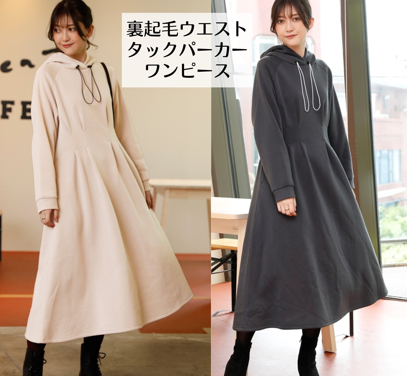 女性らしいメリハリのあるシルエットを作り出してくれるウエストタックワンピース。ウエストのタックデザインが細見せポイント!肌あたりの良い軽くてやわらかな裏起毛素材で快適な着心地。配色のゴムスピンドルがカジュアル感をプラスしてくれます。