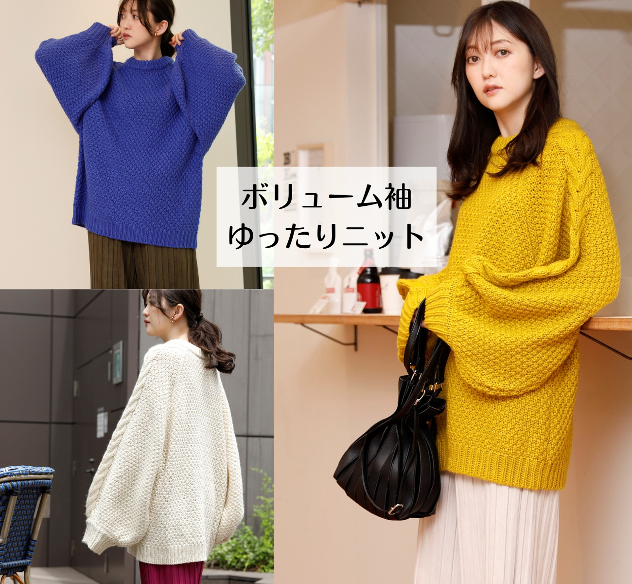 柔らかな手編み風の温かみのあるローゲージニット。たっぷりとしたボリューム袖に女性らしい編みデザインを施した、存在感のある今年らしいアイテムです。