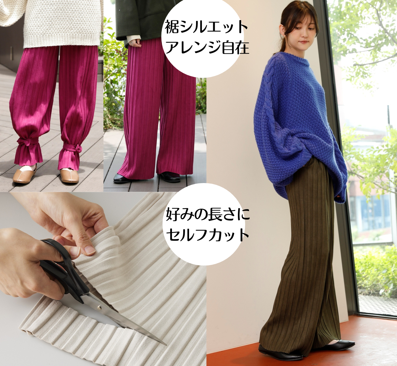 スエードのような風合いで、立体感のあるプリーツパンツ。ウエストは総ゴムで、リラックス感のあるはき心地に。またお好みの長さにセルフカット出来、付属のリボンで裾のシルエットアレンジ自由自在。きれいめにもカジュアルにも着こなせるこだわりのつまったパンツです。