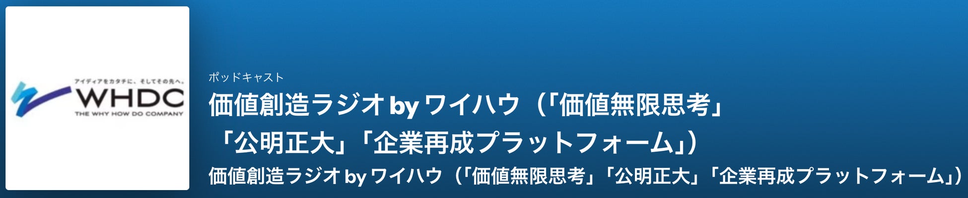 当社の理念「価値創造経営の力で、もう一度豊かになる」のもと、THE WHY HOW DO COMPANY株式会社(東証スタンダード:3823、本社:東京都新宿区、代表取締役社長:岩尾俊兵、以下「ワイハウ」)は、当社が展開するPodcast「価値創造ラジオ」において、「ブランド共創部」と連携し、視聴者の皆様からのテーマ提案を募集いたします。本取り組みは、共創共助共成サービス「CHALLENGERコンサルティング(https://prtimes.jp/main/html/rd/p/000000464.000001924.html)」との相乗効果を最大化し、より実践的な価値創造の場を提供することを目指しています。