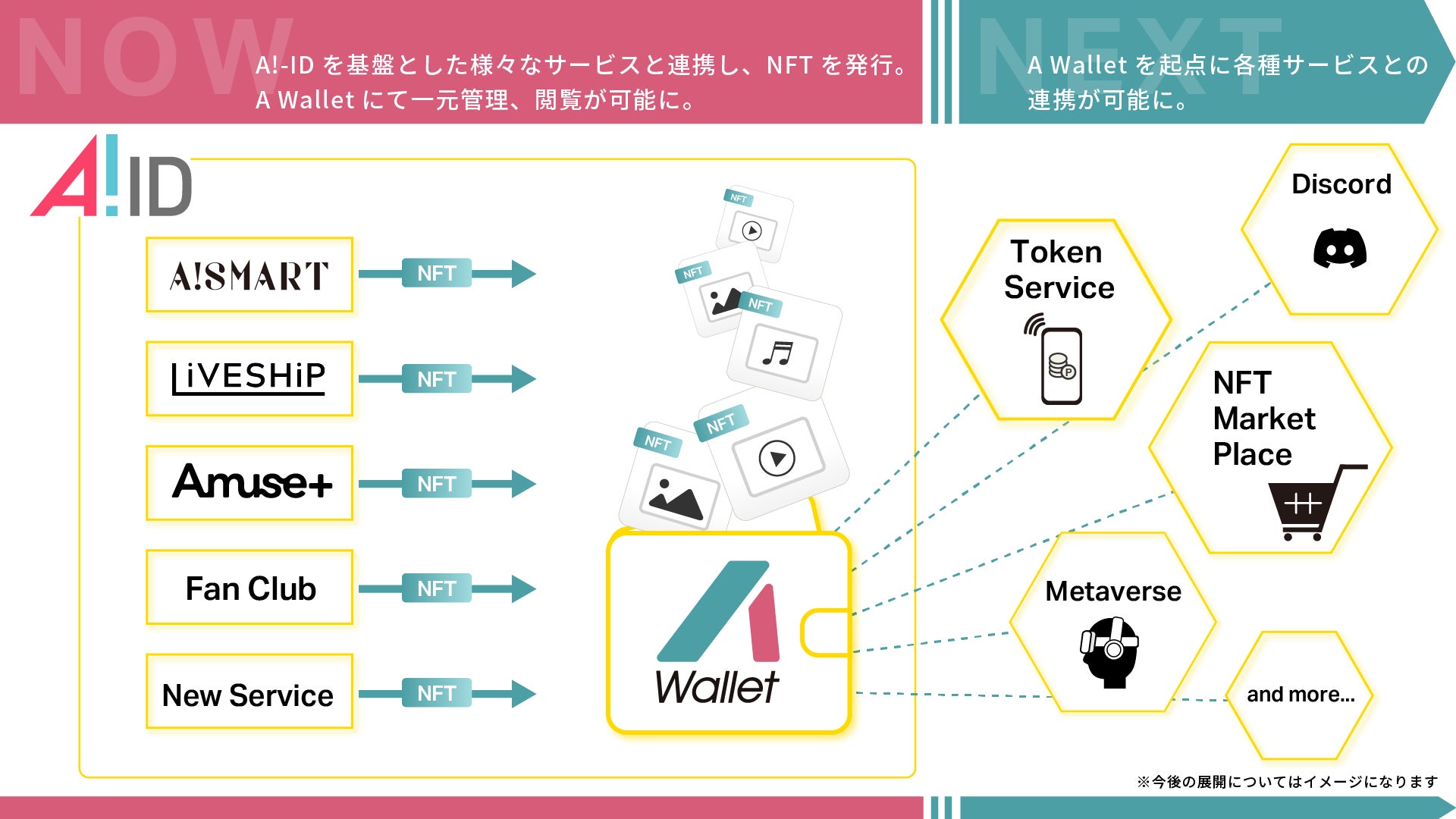今後は、社内外問わず様々なアーティストやプロジェクトのNFT施策を推進すると共に、各種外部サービスや、新たなNFTマーケットプレイスの開発や連携も視野に、国内NO.1の利用者数となるウォレットサービスを目指します。エンターテインメントの楽しみが広がる新しいカタチ、「A Wallet」の今後にどうぞご期待ください。
