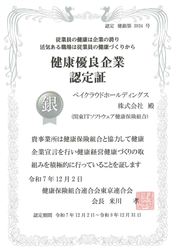 ペイクラウドホールディングス株式会社(本社:東京都港区、代表取締役社長:岩井 陽介、東証グロース:4015、以下「ペイクラウドホールディングス」)は、健康保険組合連合会東京連合会が認定する健康優良企業「銀の認定」(認定 健銀第3934号)を取得したことをお知らせいたします。