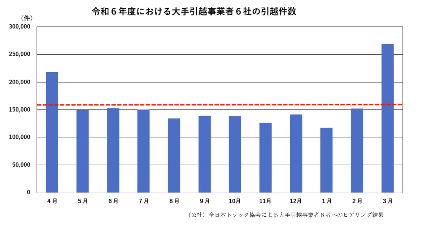 全日本トラック協会によれば、3月の引越件数は通常月の約2倍に急増します 。引っ越し料金も高騰することから、このピークを抑えるべく、国土交通省は3月下旬から4月上旬の混雑時期を避けた「分散引越」を強く推奨しています 。