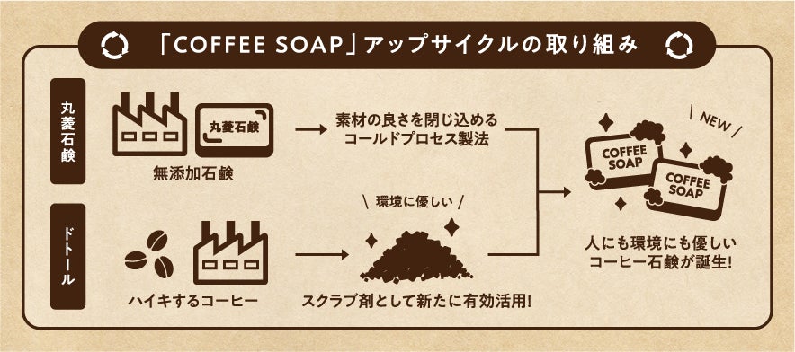 兵庫県で一貫して手作りと無添加にこだわった石鹸を作り続けて創業70年を迎えた「丸菱石鹸」と、同じ兵庫県に基盤となる焙煎工場を持つドトールコーヒーとのコラボレーションによって生まれた商品です。