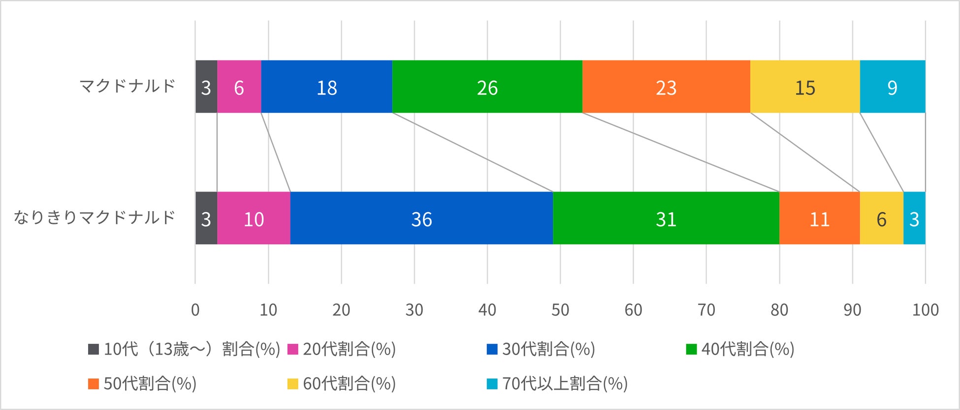 年代別の割合では、「なりきりマクドナルド」は「マクドナルド」よりも30代の検索が圧倒的に伸びており、20代と40代の割合も多いことから、対象年齢となる子どもを持つ親世代が検索の主流となっていることがわかります。