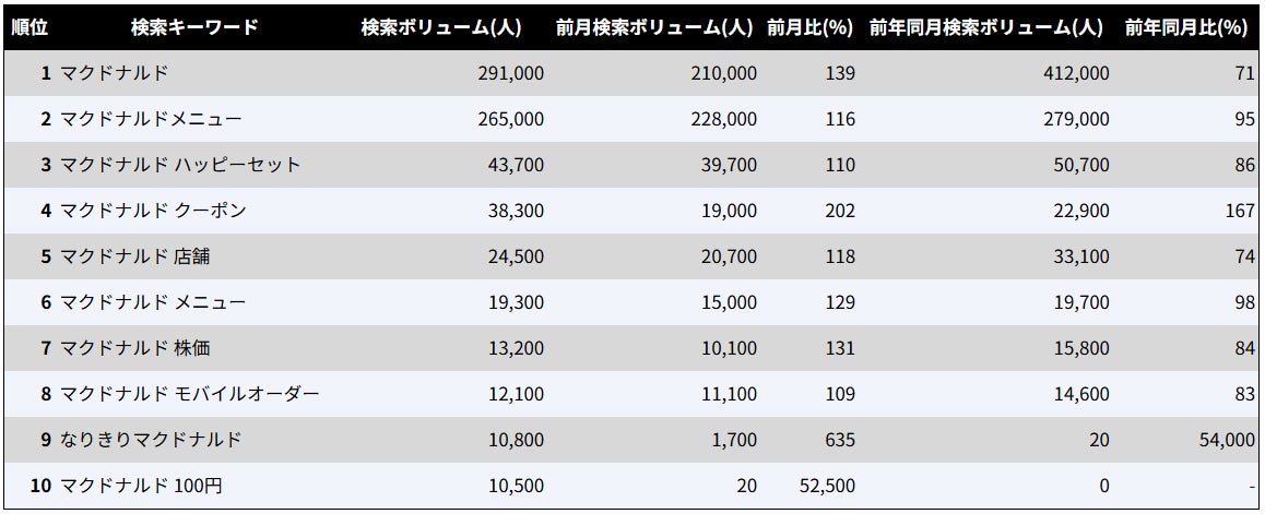 3月に「マクドナルド」を検索した人の共起キーワードには、「メニュー」、「ハッピーセット」、「クーポン」などの検索に続いて、「なりきりマクドナルド」が特定のキャンペーン名として上位に検索されており、同キャンペーンに大きな注目が集まった様子が見られます。