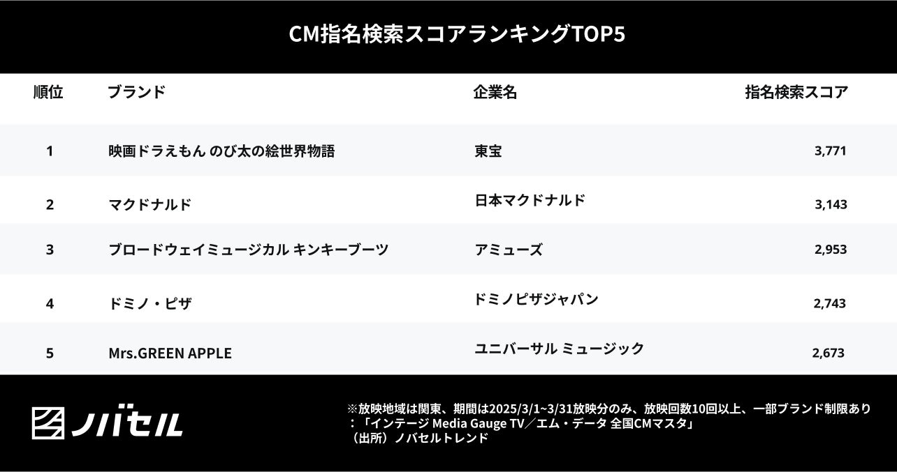ソフトウェアとプロフェッショナル人材の力でマーケティングの民主化を目指すノバセル株式会社(本社:東京都港区、代表取締役社長:田部正樹、以下ノバセル)は、テレビCM効果の分析サービス「ノバセル トレンド」を活用し、2025年3月に放映されたテレビCMの指名検索スコアランキングを発表いたします。