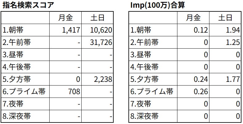 CM放映の曜日と時間帯別では、土日を中心に午前中と夕方に放映が集中しており、とりわけ土日の朝帯と午前帯で高い指名検索スコアを獲得しています。この結果からも、子どもと過ごす時間の多い週末の午前中に、親世代の検索が集中したことが考えられます。