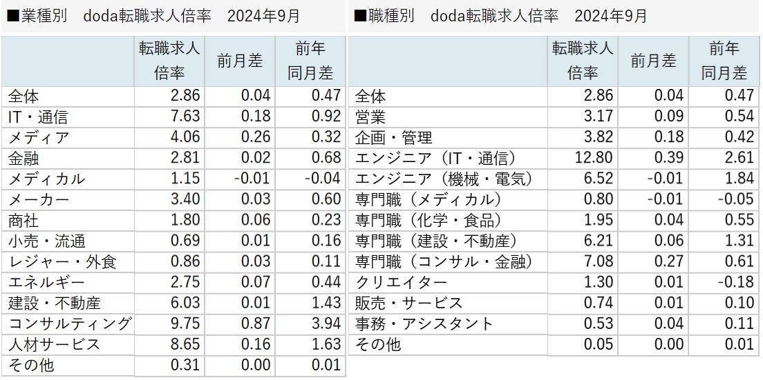 パーソルキャリア株式会社が運営する転職サービス「doda(デューダ)」(編集長:桜井 貴史)は、2024年9月の転職求人倍率をまとめた「doda転職求人倍率」を発表いたします。