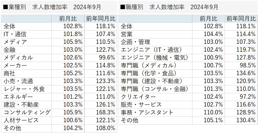 求人数は、業種別では12業種(「その他」は除外)のうちすべてで前月から増加しました。最も増加率が大きかったのは「コンサルティング」「メディア」(前月比105.9%)でした。職種別では11職種(「その他」は除外)のうちすべてで前月から増加しました。最も増加率が大きかったのは「事務・アシスタント」(前月比110.0%)、次いで「営業」(前月比104.4%)でした。