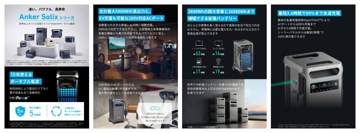 また、Anker史上最大容量ながら、ACポートからは80%充電までわずか2.6時間(※5)で充電できる独自の急速充電技術「HyperFlash™」を搭載。加えて、現在開発中のホームパネル「Anker Solix Home Power Panel」と接続することで、停電時でも、本製品や拡張バッテリーに溜めた電力で自宅の家電を動かすことが可能になる(※6)という、画期的なソリューションをご提供致します。