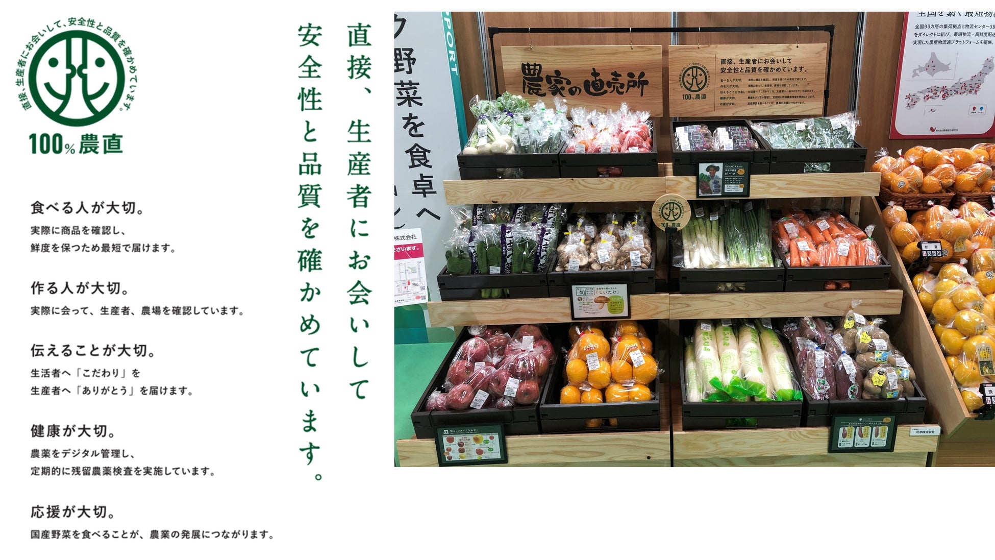 農業総合研究所が運営する全国の集荷拠点で集荷した新鮮な農産物を都市部のスーパーマーケット内に設置したインショップに最短1日でお届け・販売する独自の流通プラットフォームです。