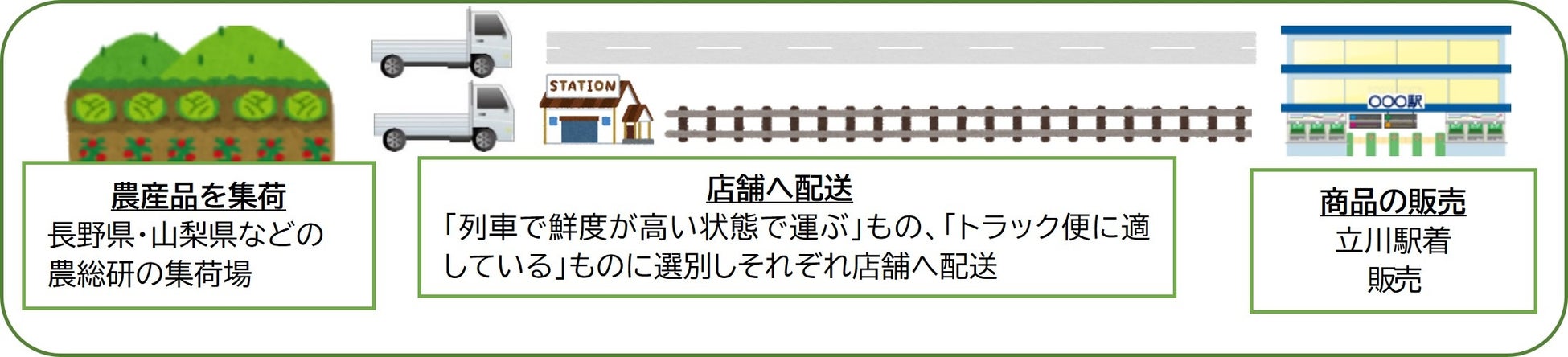 トラックによる輸送のほか、一部の商品はJR東日本グループが取り組む列車を活用した荷物輸送サービス「はこビュン」にて、長野県・山梨県で収穫した農産品を中心に立川駅まで輸送します。