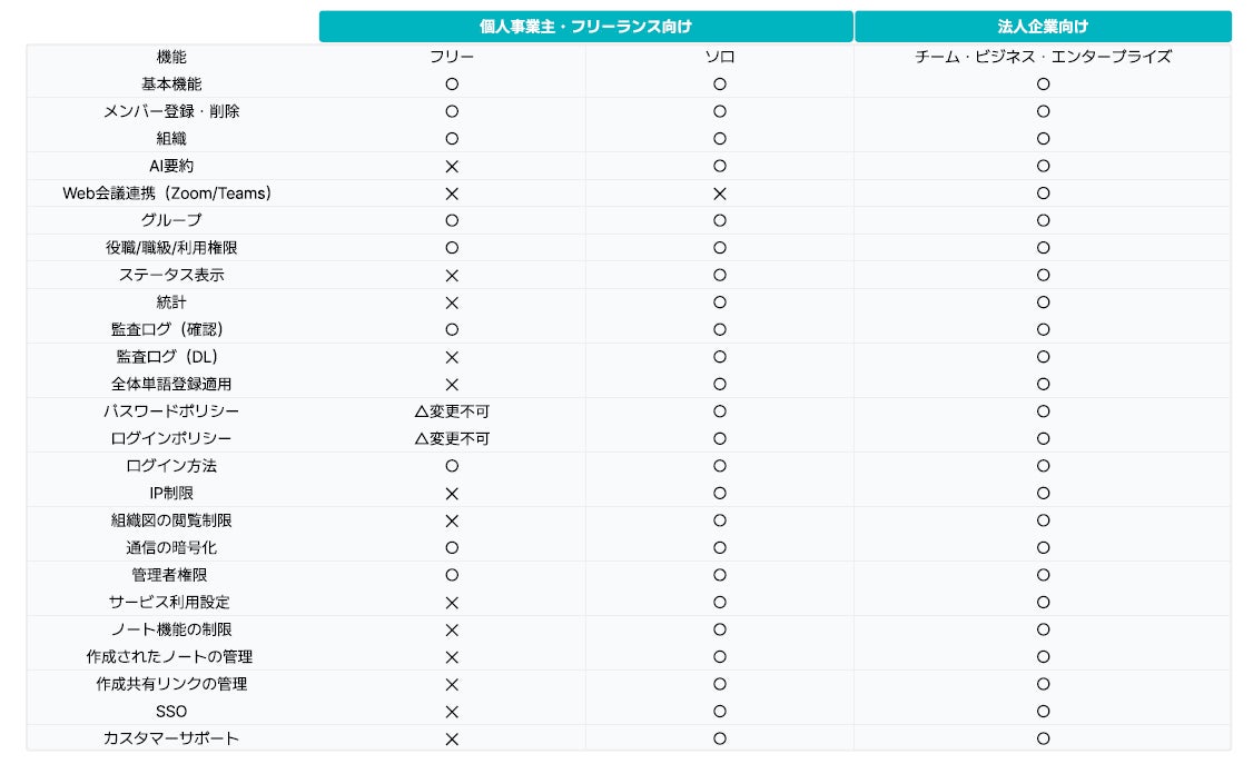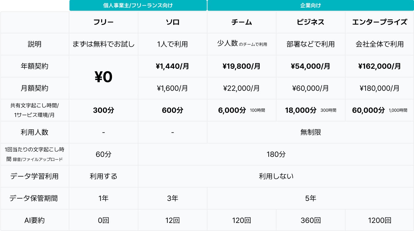 2024年11月より、フリープランの提供を開始していましたが、この度、有料版の提供を開始しました。これにより、文字起こし時間やデータ保管期間の延長、AI要約などをご利用可能となります。